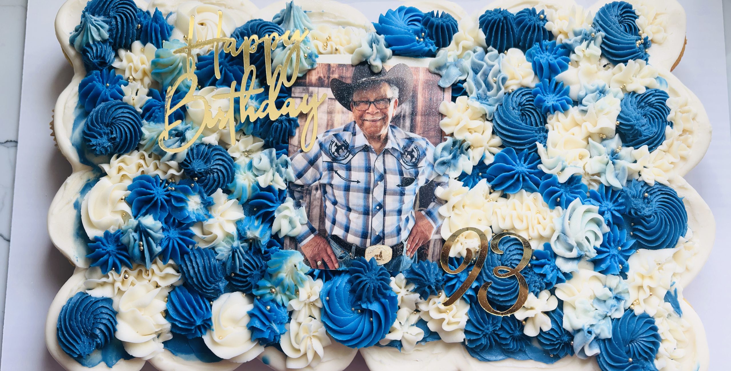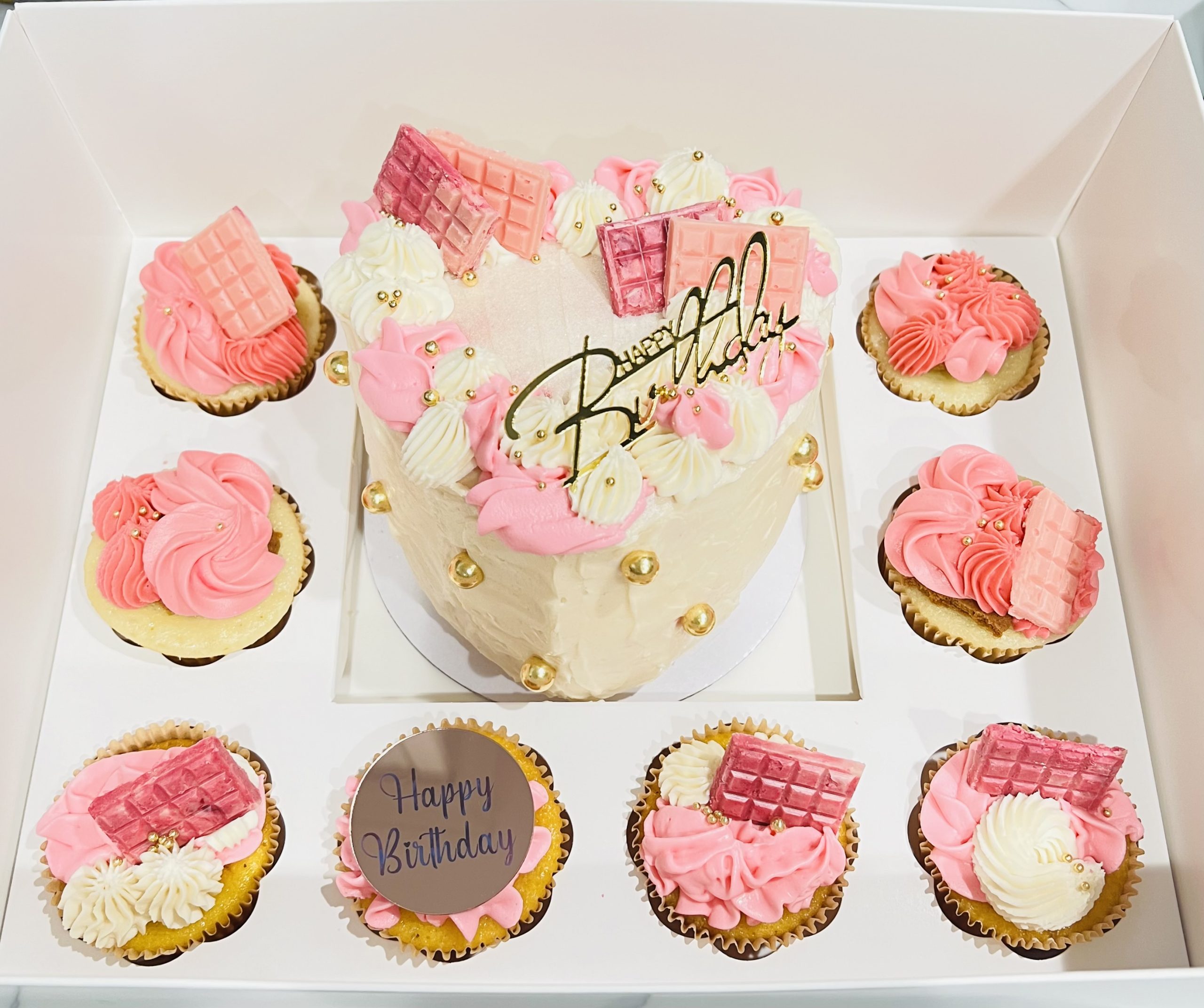 Design limited to bakers choice, floral extra. Includes 5in. double layer cake (one flavor, two colors) + 8 standard size cupcakes (one flavor, same colors as cake) + optional Happy Birthday Cake Topper